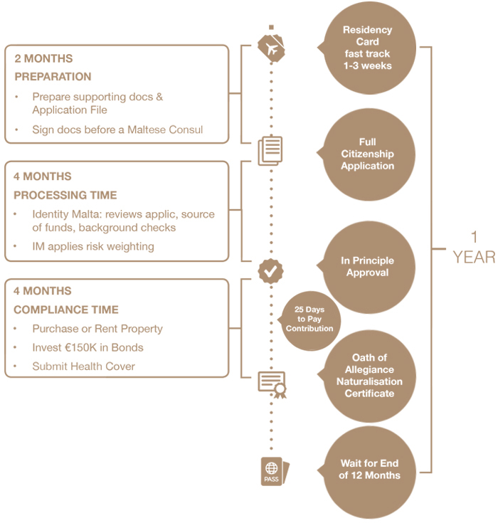 The main applicant must be 18 years of age and in good standing; Home purchase or rent at €350,000 /16,000p.a.; Contribution of €650,000; Establish a residency in Malta; Buy Government bonds amounting to €150,000.
