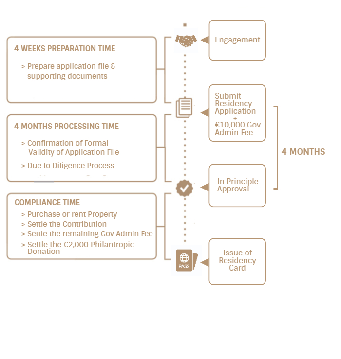 - Government Admin Fee – €60,000 (An additional government fee of €7,500 applies for each additional adult child or parents of the applicant/spouse)